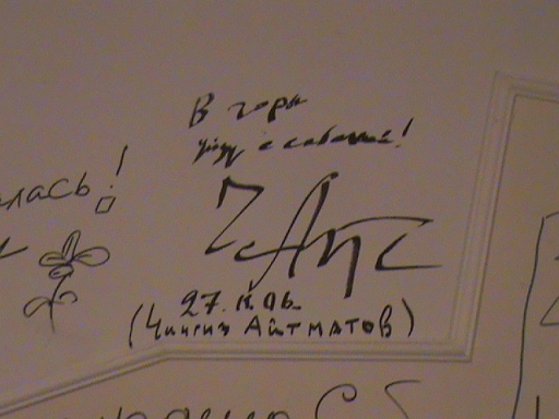 Меня поразила многозначность этой фразы: «В горы уйду с собакой!». С одной стороны, очевидно так и принято у тех, кто живет в горах — у охотников, у странников, у художников. С другой стороны, эта фраза, написанная здесь, означает, что в горы он уйдет, унося с собой воспоминание о «Бродячей собаке», воспоминание об этом литературном кафе (возможно, тут у него была встреча с читателями), о частичке русской культуры, частичке культуры Серебряного века. Но если читаешь эту надпись 8 июля 2008 года, когда не прошло еще и месяца, как писатель ушел из жизни, невольно думаешь, как много он унес с собой и того, о чем еще только собирался написать. Я сфотографировала эту надпись, еще и не предполагая, что скоро смогу показать ее здесь, на родине писателя.